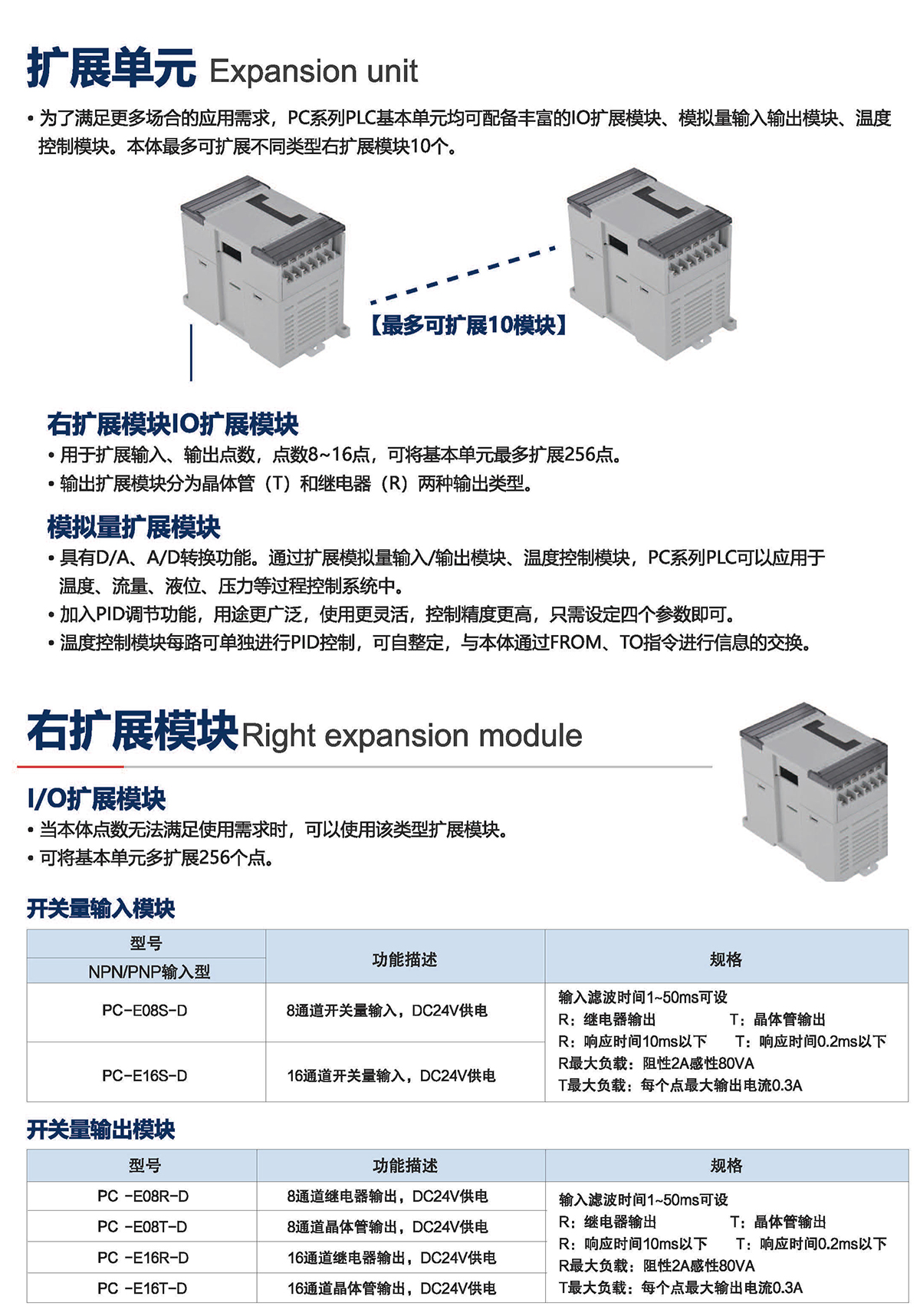 为了满足更多场合的应用需求, PC系列PLC基本单元均可配备丰富的IO扩展模块、模拟量输入输出模块、温度 控制模块。本体可扩展不同类型右扩展模块10个。