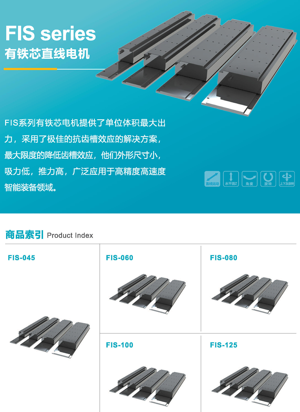 FIS系列有铁芯电机提供了单位体积最大出力,采用了极佳的抗齿槽效应的解决方案,最大限度的降低齿槽效应,他们外形尺寸小,吸力低,推力高,广泛应用于高精度高速度智能装备领域。