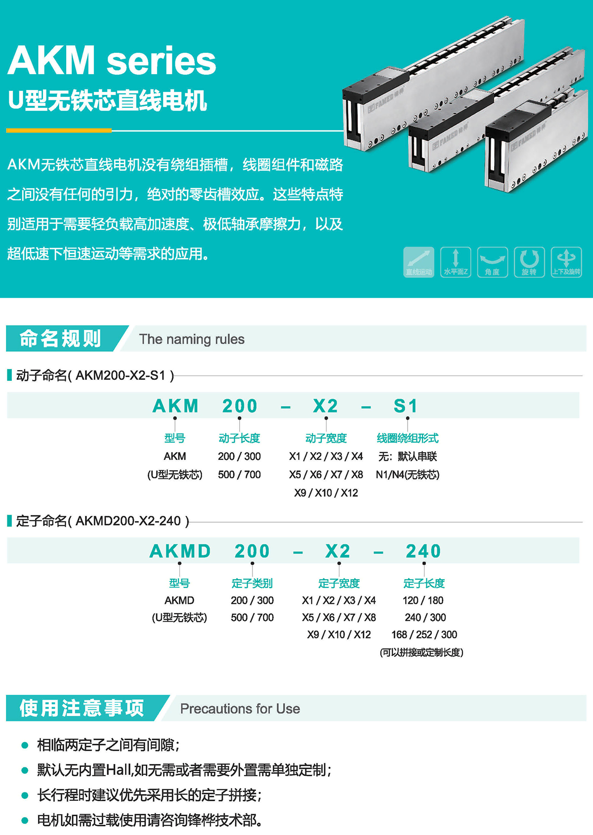 AKM无铁芯直线电机没有绕组插槽,线圈组件和磁路之间没有任何的引力,绝对的零齿槽效应。这些特点特别适用于需要轻负载高加速度、极低轴承摩擦力,以及超低速下恒速运动等需求的应用。