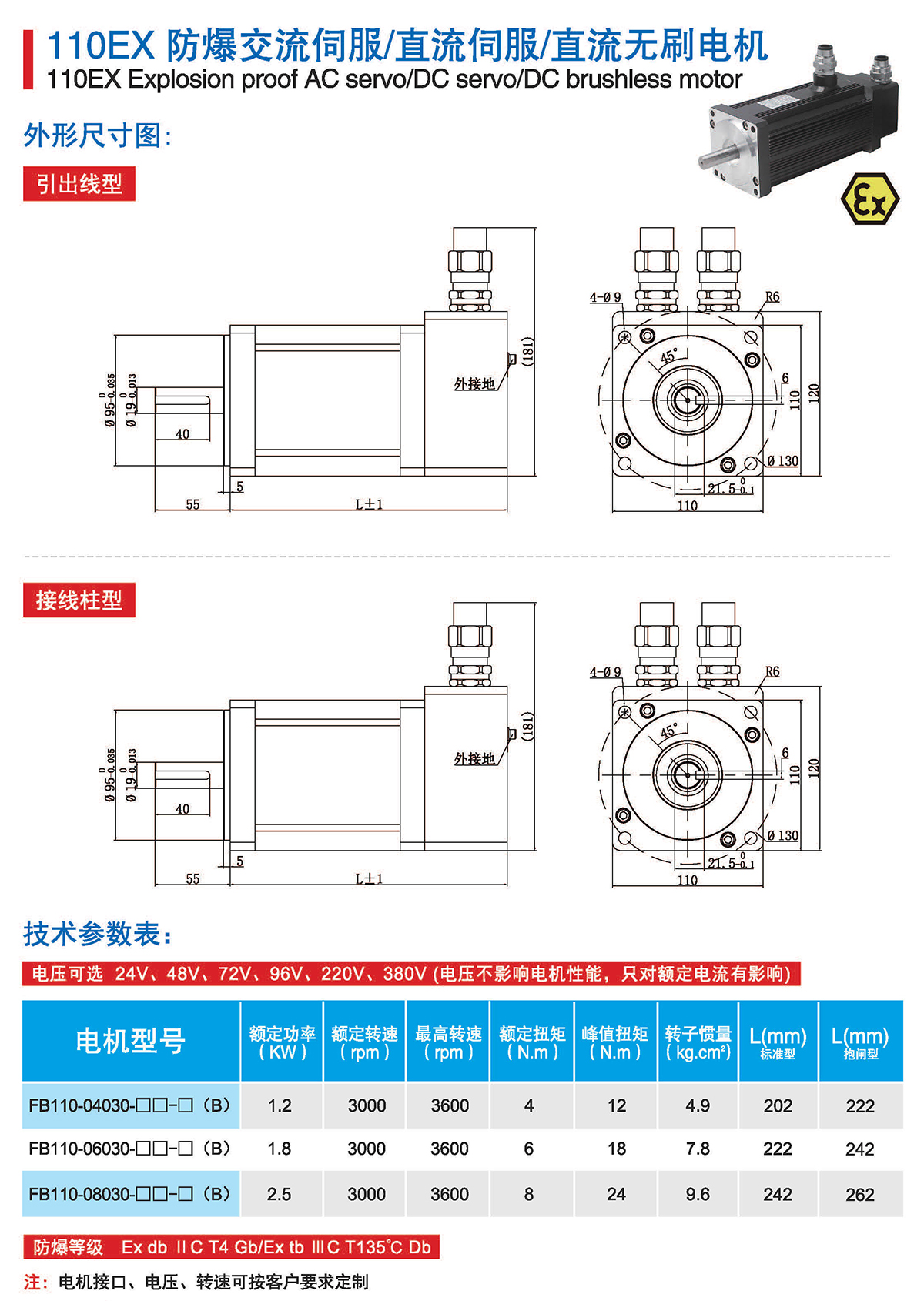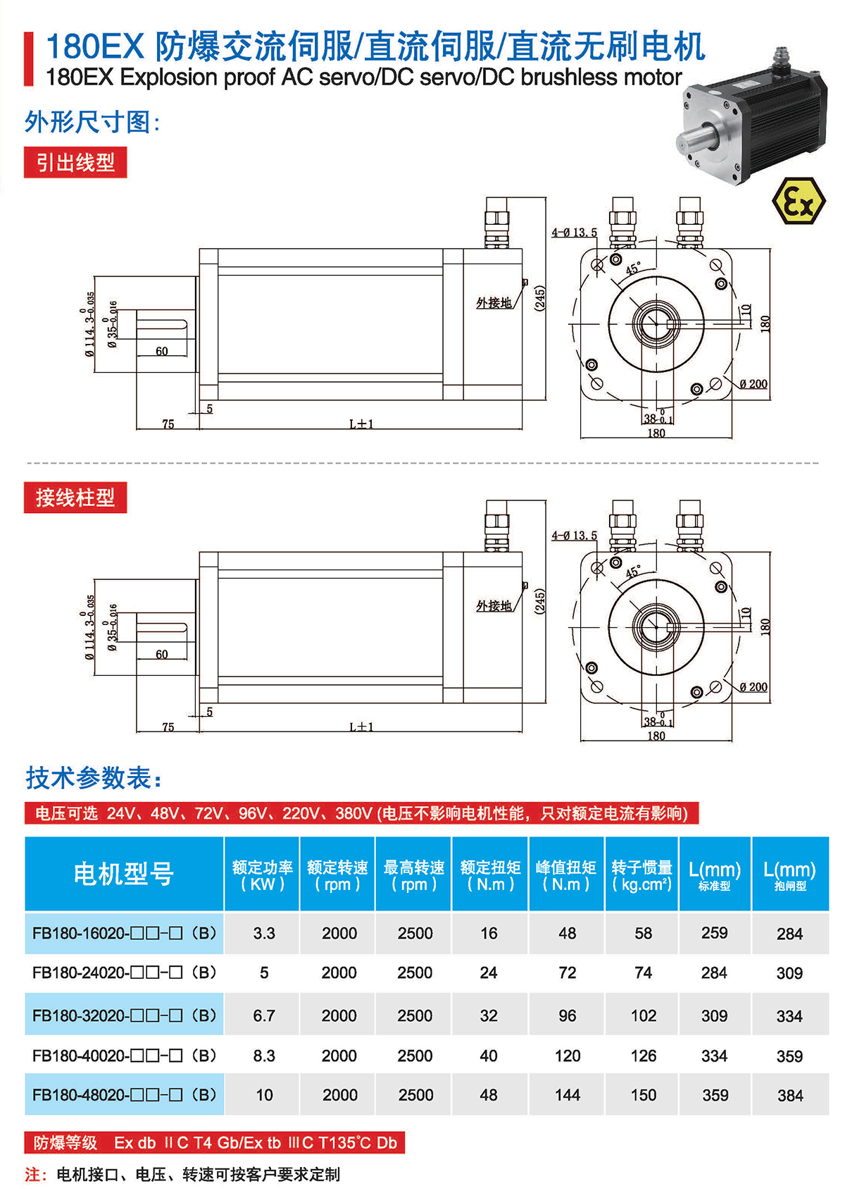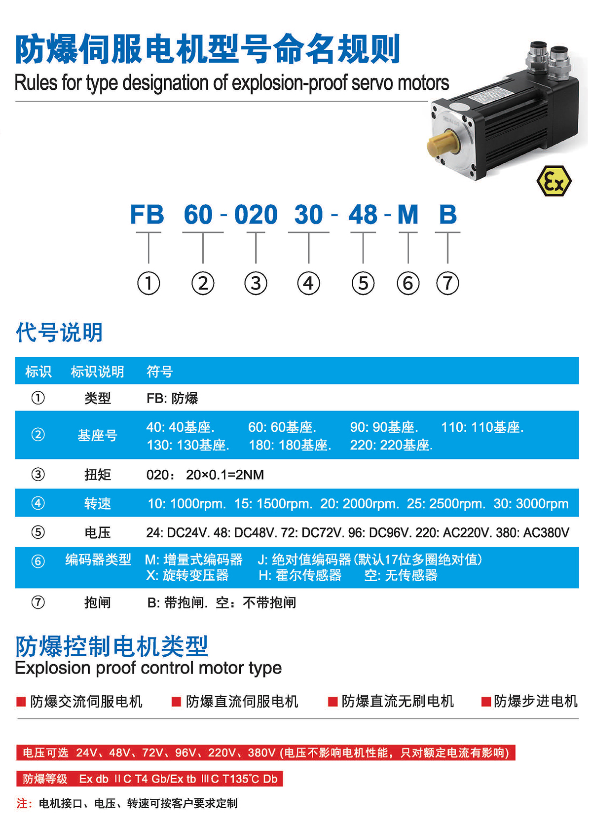 FB系列为气体1区、粉尘21区防爆伺服电机,FB系列防爆伺服电机地面防爆场景全适用,广泛应用于油气、医药、喷涂、印刷等行业。严格按照防爆标准执行所有研发、设计和制造,为系统集成商和设备制造商在防爆环境下的应用保驾护航。